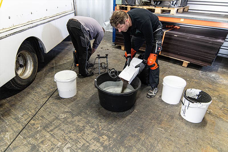 Nun geht es ans Mischen des 3-Komponeten-Flüssiggummibodens. Die Komponenten – ein flüssiger Naturlatex, ein Härterpulver und das spezielle Granulat – werden ganz einfach in einem Fass vermischt. Das ist ebenso unkompliziert wie sicher. Es entsteht eine breiige Masse in dunkelbraun oder schwarz.